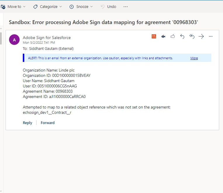 But while the Signature process takes place I recieve an error saying "Attempted to map to a related object reference which was not set on the agreement: echosign_dev1__Contract__r".