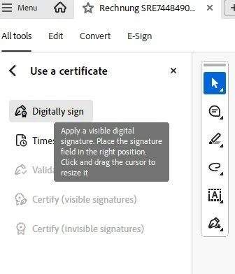 One of our users cannot digitally sign (All tools - use a certificate - Digitally sign) PDF's anymore in Acrobat Reader.