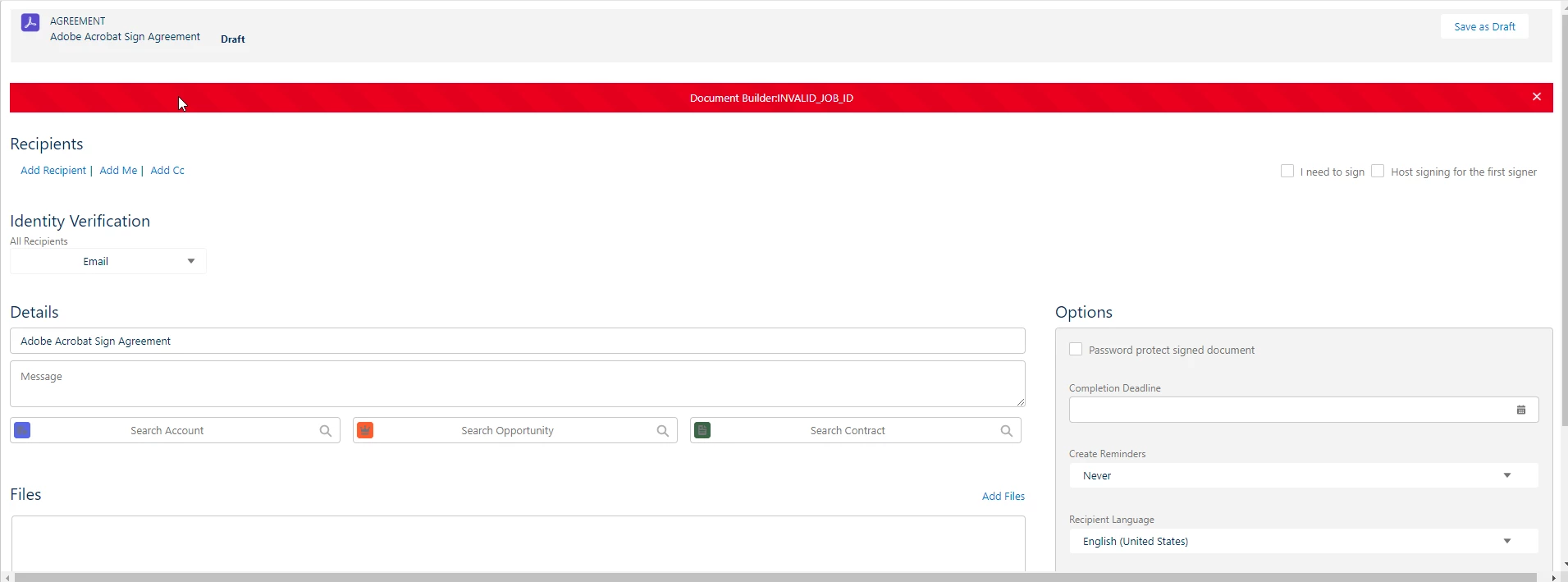 We are using Adobe Sign for salesforce and generate our documents in salesforce however we are unable to create any documents from a salesforce record page any more as we get the Document Builder:INVALID_JOB_ID. Any thoughts on what to look for?