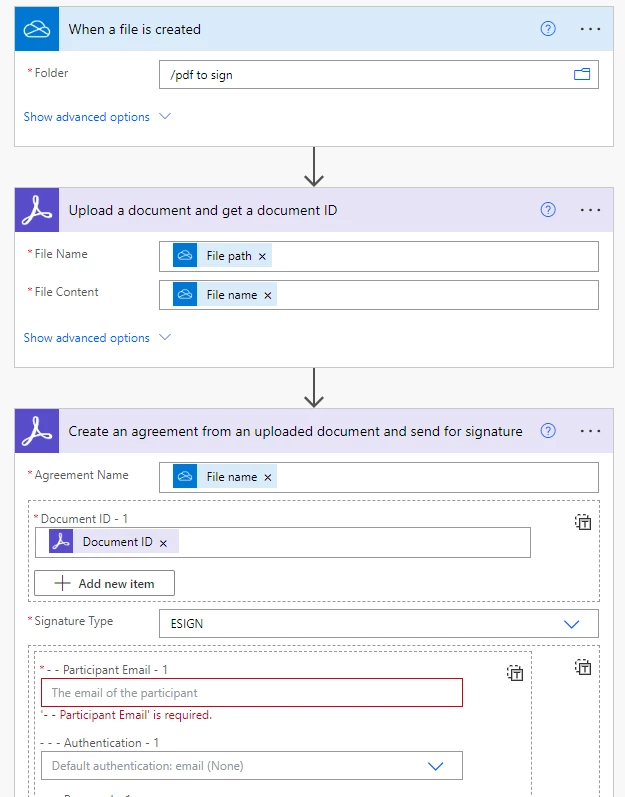 I am using Power Automate to create a flow for Adobe signature purposes. Basically when a pdf is created in a specific folder it is sent to Adobe for an ID. It is then supposed to create an agreement and upload for signature. Unfortunately i get a generic error that the Document Upload has encountered a probelm. I can see the document in the Adobe center but when i click it nothing populates. Outside of Adobe i can see, edit, and print the pdf document as normal. Attached you will find the power automate flow minus the email I am sending to.