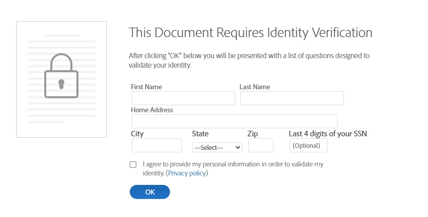 It seems that you are using the Knowledge-based authentication (KBA). Currently, the feature is only applicable to US-based recipients. You may try different modes of authentication. For more information on Acrobat Sign authentication, refer to the following help document: https://adobe.ly/4b8Pwrs.