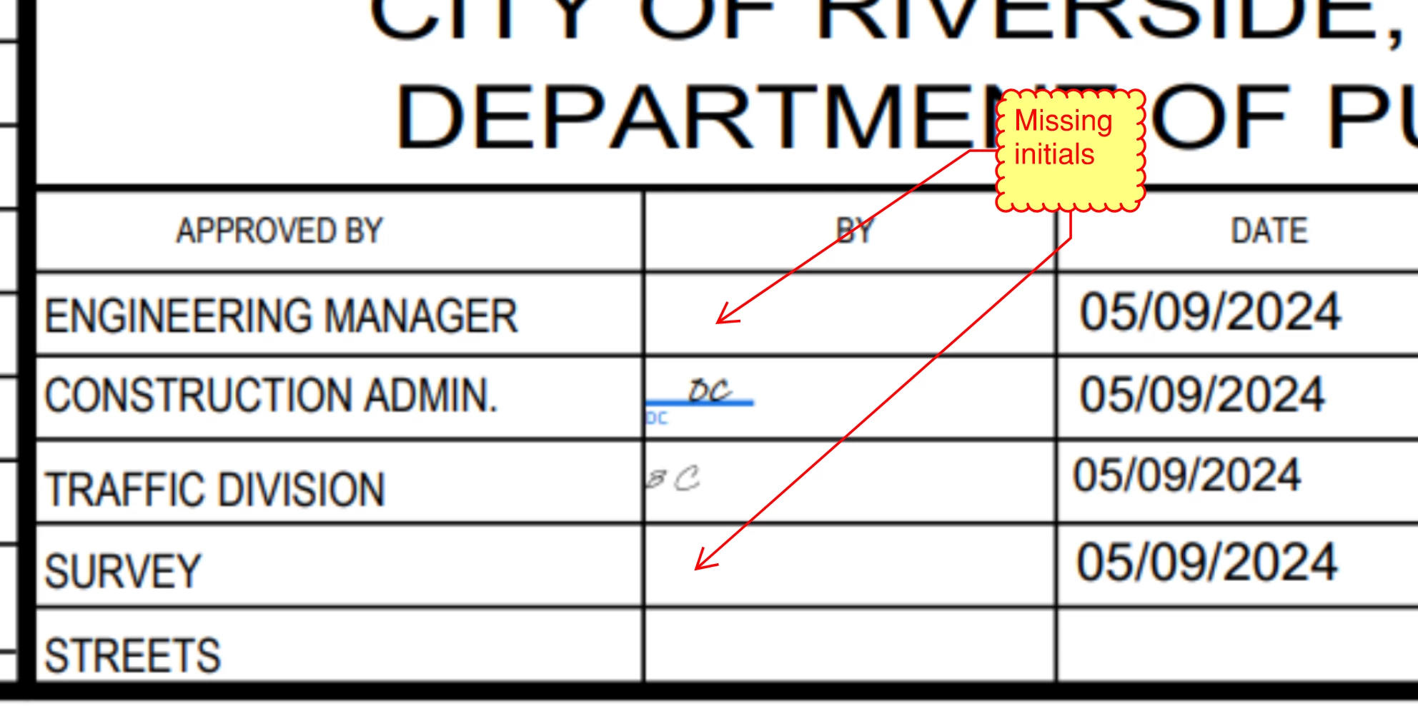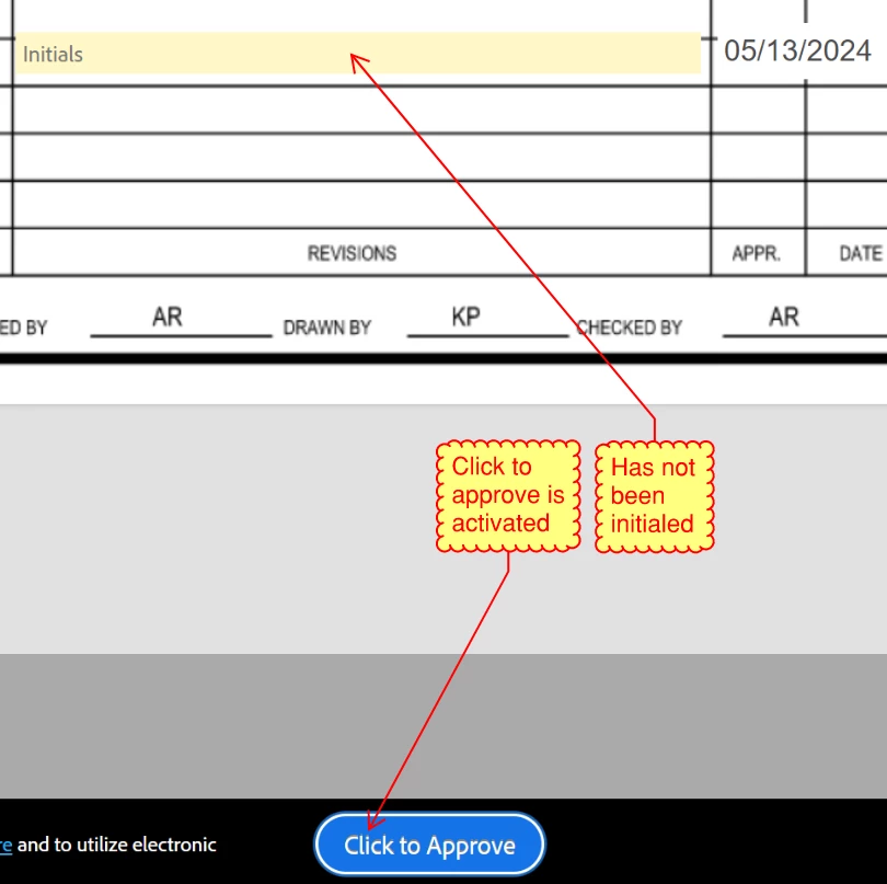 A glitch in the e-sig workflow allows approvers to "Click to Approve" even though they have not initialed the document.