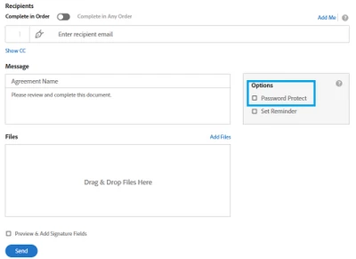 ​I want to send a PDF using E-Sign and after going to this screen I do not appear to have the password protect product option as shown below.  I am using Adobe Acrobat Standard DC.
