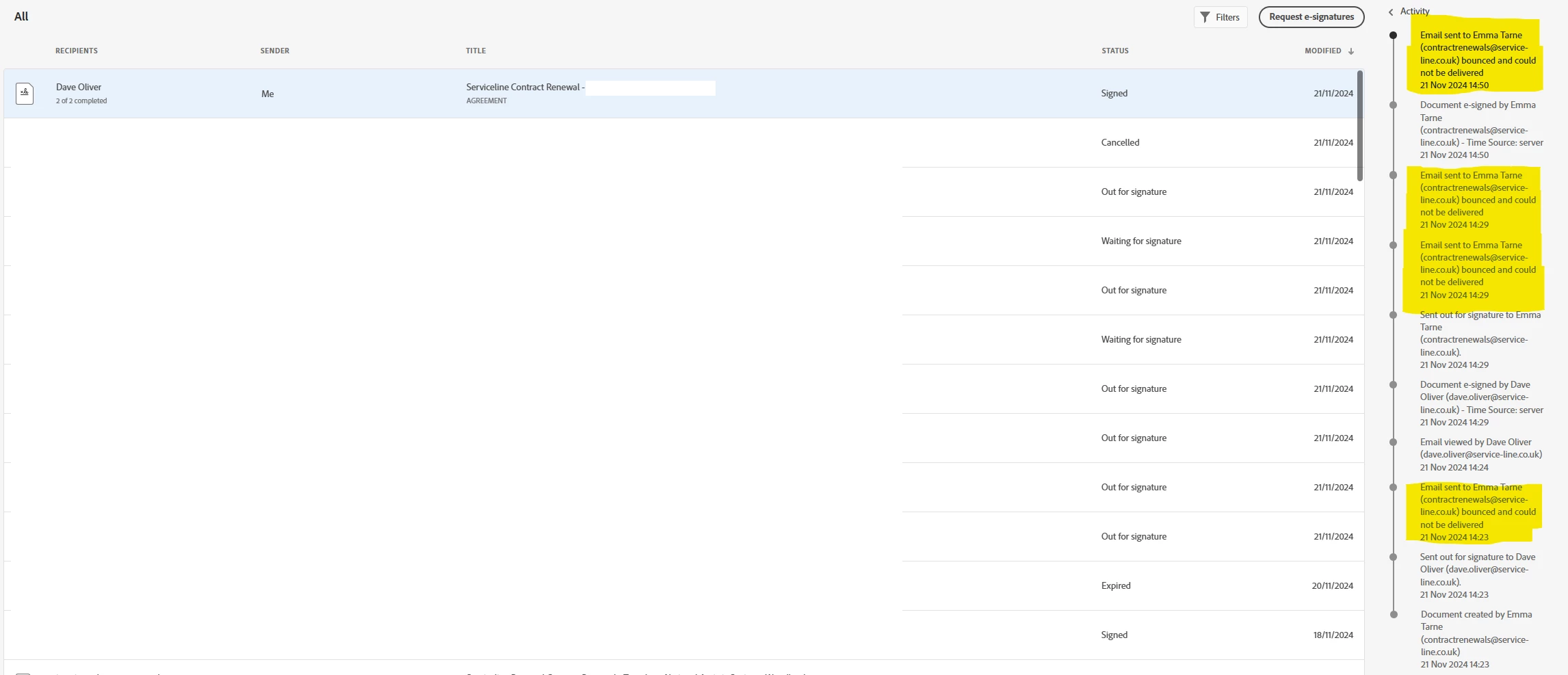 Hello, we are having an issue with emails bouncing but it only seems to be to the address of the account that created the document to be signed.