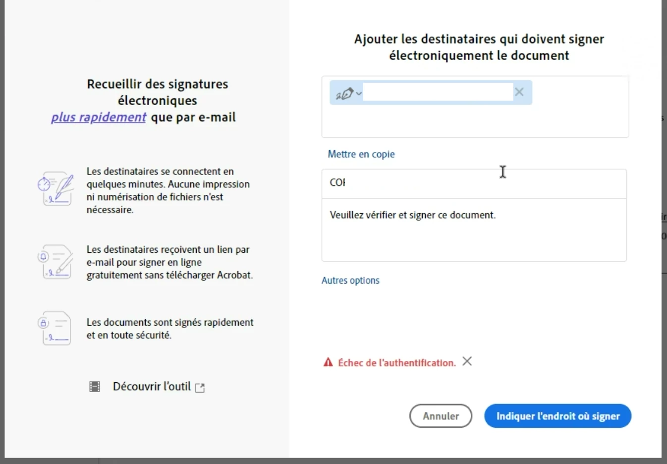 "I have a problem in Adobe Acrobat: whenever I try to request electronic signatures, I keep getting the error 'authentication failed', even though I am logged in, I do have an Adobe Acrobat Pro and Acrobat Sign license."