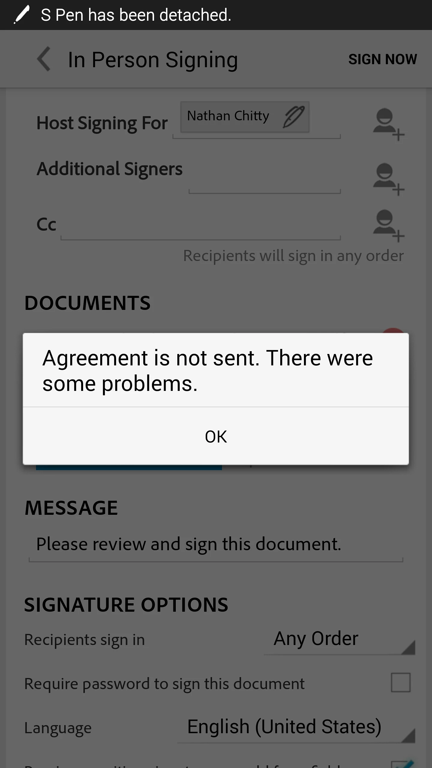 I am getting the error message: "Agreement is not sent. There were some problems." There is no way to contact Adobe support by phone or chat.
