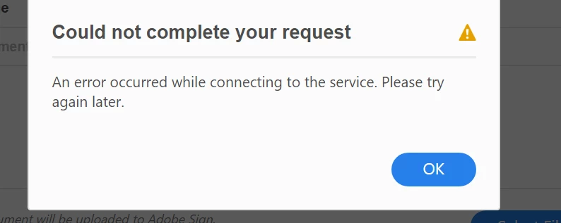 I just sent two documents for signature with no issue. I went to send the third document and have been receiving the same error message over and over again. "an error occurred while connecting to the service". I have opened and closed the program.
