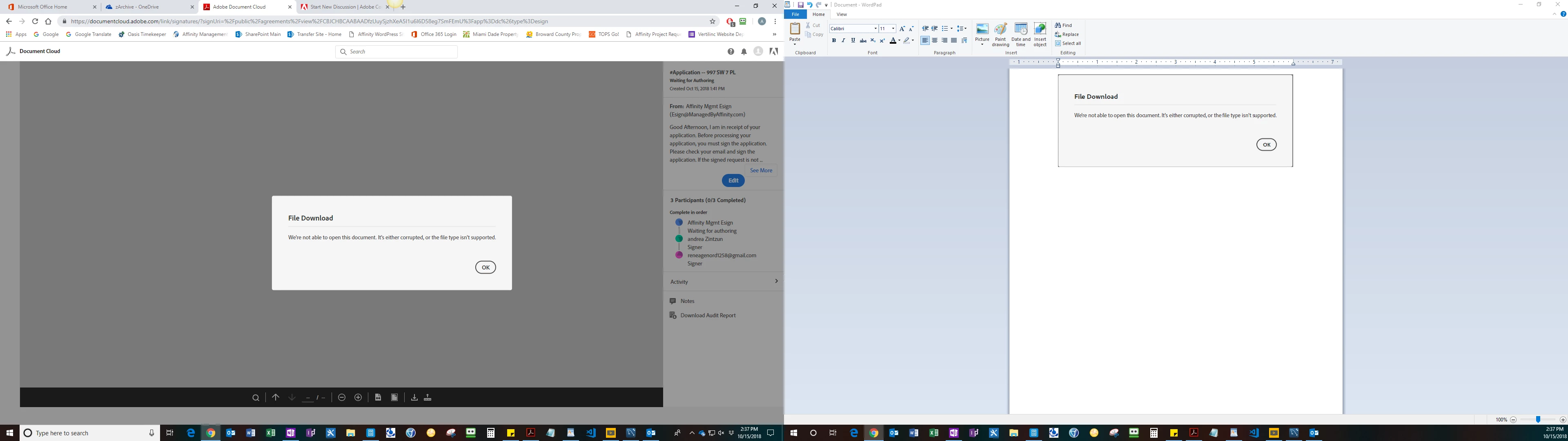 Error opening a "Send for Signature" document on Document Cloud.