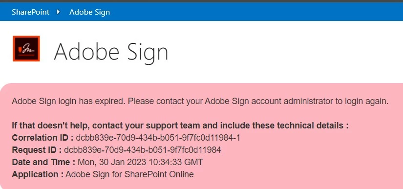 Just installed Adobe Sign add-on on a SharePoint. Sign options show up on contextual menu, but if I send a file for signatura, new winddow with url https://sharepointonline.echosign.com/XXXX opens but or it get stuck on a loadin loop or it answer with error "Adobe Sign login has expeired. Please contact your Adobe Sign account asministratot lo login again"