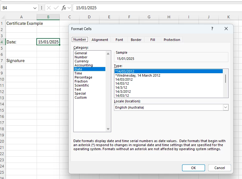 The excel document has dates formatted as dd/mm/yy, with cell type as date. (see screenshot Excel Screenshot.png)