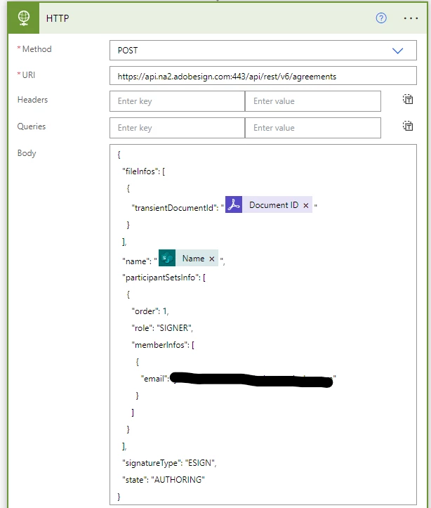 I am using power automate to automate some of our processes around sending agreements out. Basically when another process drops the document into a specific SharePoint doc library, it triggers my power automate flow to pick up the doc and send off for signing. That all works well, but the issue is I need to place the signature fields on the document in specific locations. From my research it appears I need to pull the agreementID (Not the DocumentID) while the agreement is in authoring mode so that I can add the form fields. I can't figure out how to get the agreementID back via the API (there doesn't seem to be a pre-built power automate connector for that). And also assuming my logic is correct about the placing of the signature fields on the form.