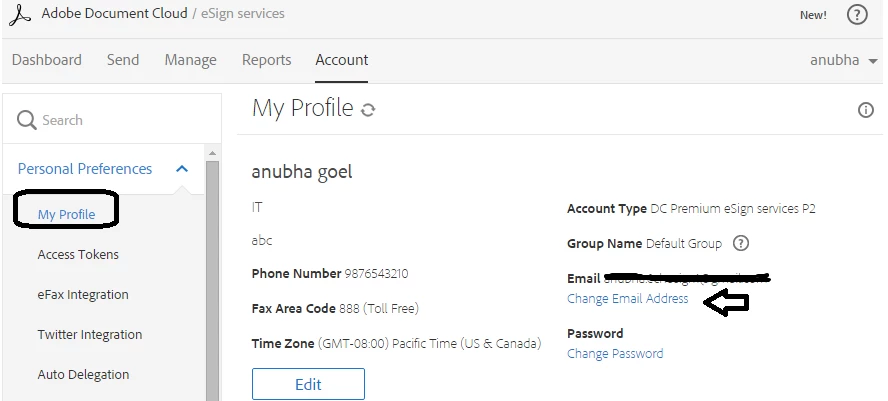 Simply sign in to your eSign account and click on your name to open My Profile.