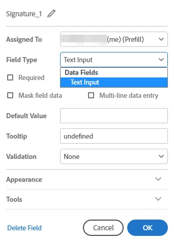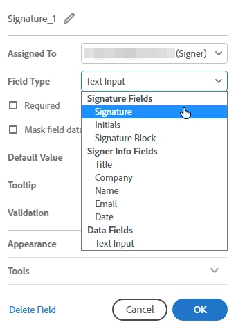 Hello, I am using Adobe Sign to collect signatures and fill out forms. I am trying to assign a field as signature to the prefiller, but whenever I select the prefiller, I no longer have the option to select signature in the Field Type. It only gives me the option to assign signature fields to signers and not the prefiller.