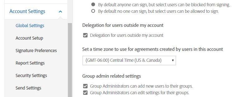 List of settings in Adobe Sign