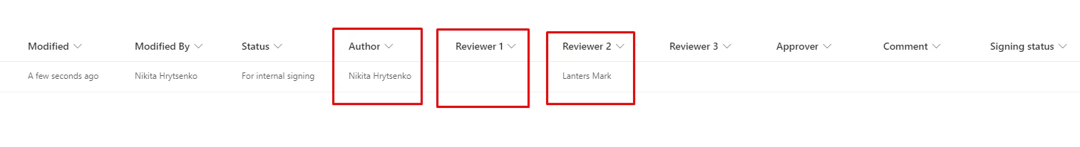 For example, I have max 5 people for signing, which can be chosen in corresponding columns: Author, Reviewer 1, Reviewer 2, Reviewer 3, and Approver.