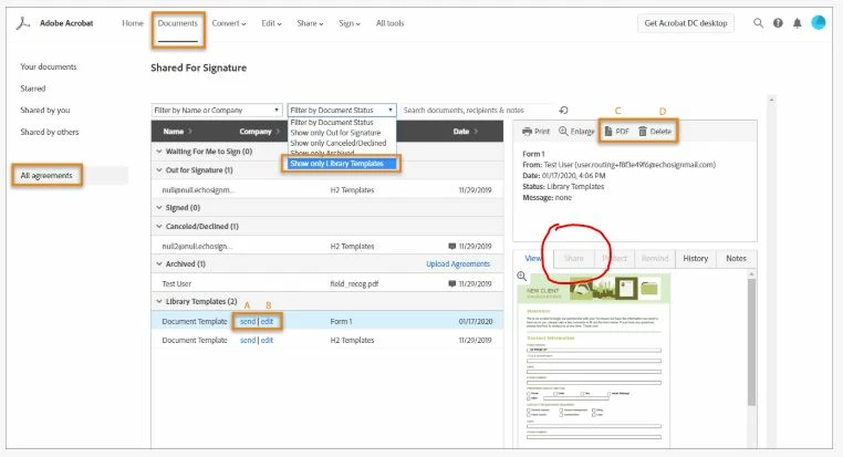 There appears to be no way to share a template. All the help documentation around sharing templates appears to be related to a different environment (http://echosign.adobe.com/) which support has told me to use, however there is NO way to access this echosign URL as it redirects straight to acrobat.adobe.com.