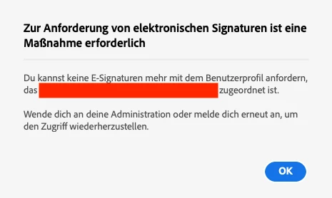 “You can't request e-signings with the User Profile anymore that is connected to <my main account address>. Please ask an administrator or sign in again to gain access again.”