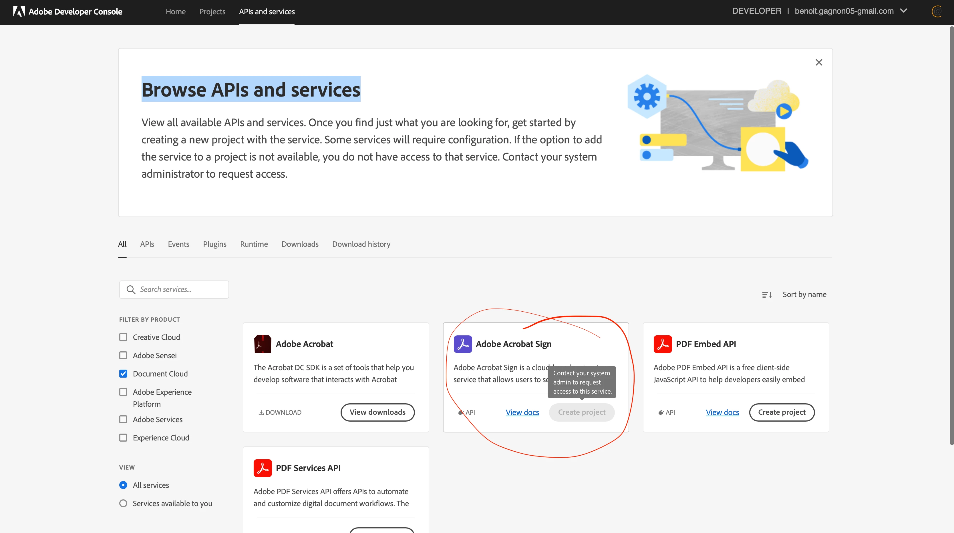 Hi i have creative cloud plan, i created account developper and i would like to create an app with adobe sign API, but the button is not available (GREY) and mouse hover button is write "Contact your system admin to request access". The system admin is me, why?