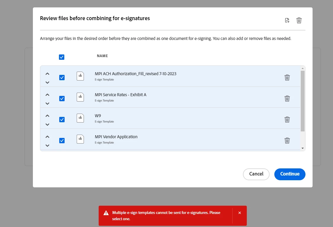 We used to be able to send multiiple documents for e sginature. Now getting a new window and an error message .