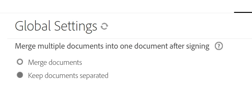 The responses posted in 2018/2019 about changing the Global Settings, and selecting the 'Keep documents separated' toggle is not available in the latest version of Adobe Esign (at least not that the Admin could find).