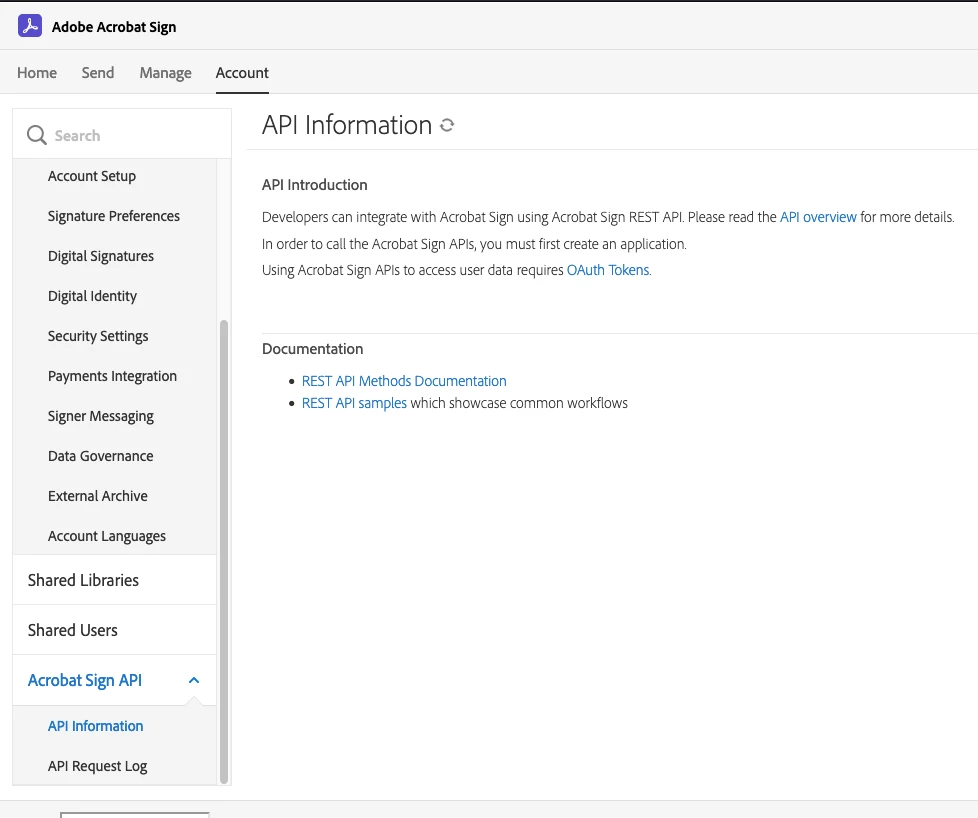 I'm wondering if I somehow have an account that doesn't have access to API features, but I can't seem to find a page that lists what features I have access to. My Account page says I have "Acrobat Sign Solutions for small business" if that helps.