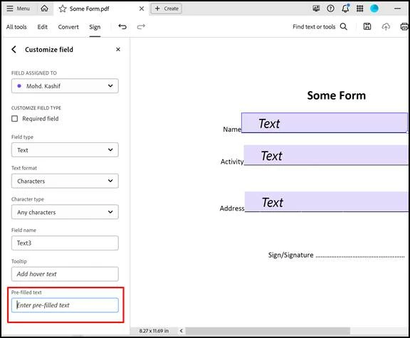 In the new request signature experience, fields can be pre-filled by right-clicking on any field -> clicking on customize Field and entering the prefilled value in the left-hand panel.