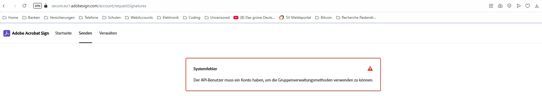 i have a serious problem with my (free) AdobeSign account. I'm not able to send documents for signment any more - I get following error after click on the "Send" button at the Web-FrontEnd of AdobeSign