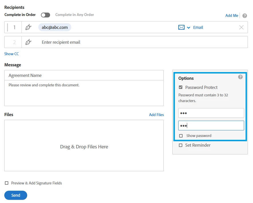 - Passwords are not exposed in the agreement records, nor are they recoverable after the agreement is sent