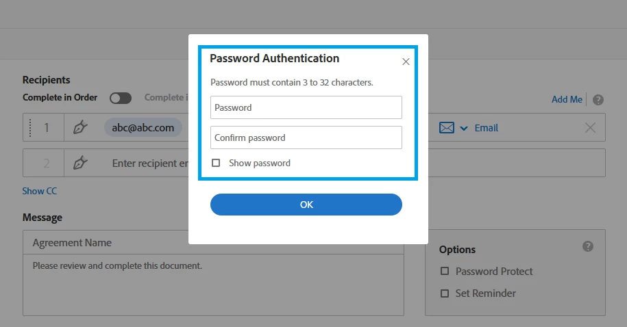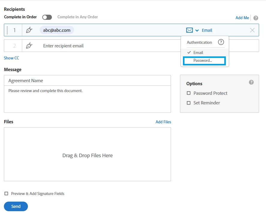 Another option to set up the password for the document is provided to authenticate the signer. You can find this option on the right-hand side of the recipient email address fields.