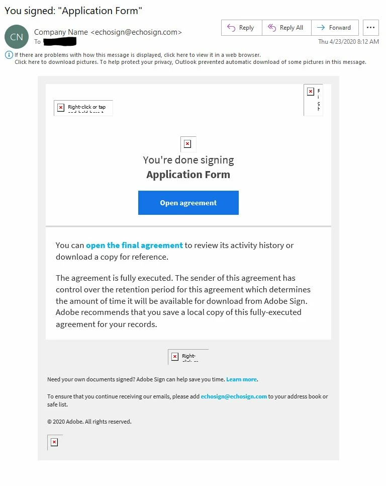 I received an email from echosign@echosign.com this morning titled: You signed: "Application Form"