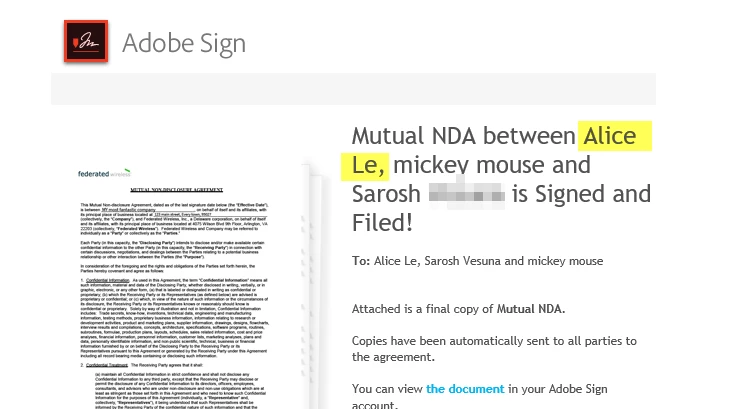 Is there a way to get my name off of the completed doc confirmation? In this example, "mickey mouse" went to the webform and populated the initial signature, it was then routed to Sarosh (my designated countersigner from legal) and I was uninvolved, but my name is still #1 on the confirmation: