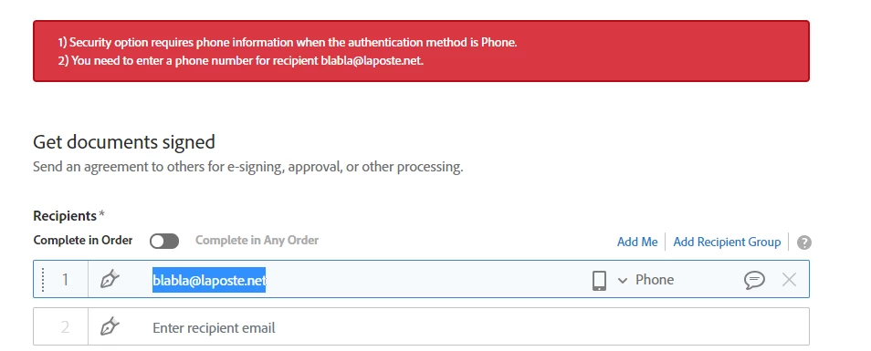 I can't make sign him because it's his first connexion and Adobe Sign needs a phone number (as you can see at the end of my message).