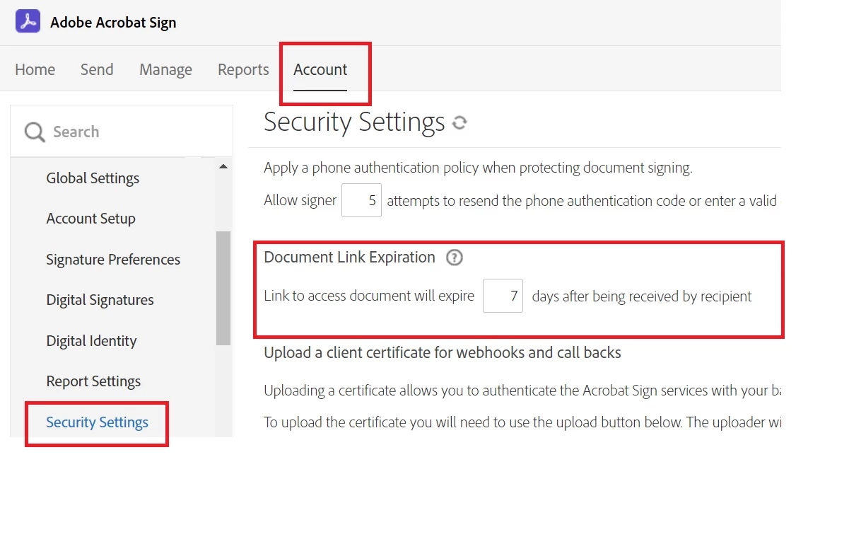 Trying to figure out how to change the expiration time on a link. I "think" it is set to around 30 days but conflicting info on Adobe website. Issue - send the request for e-sign and person ignores and then when it states to "click here" to refresh link, they stop and ask me for a new document and process starts again. I am trying to extend link expiration to 90 days to avoid the expiration. Adobe suggest to go to Account Settings/Security Settings/Document Link Expiration and change from 7 to 90 but I cannot for the life of me find how to get to the section. Any help would be truly appreciated. Thanks.