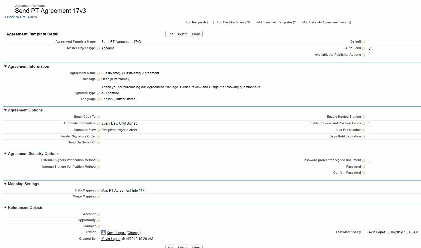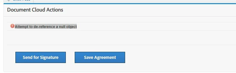 I have made an apex trigger within Salesforce that creates an Agreement when a new account is created but I am unable to make it automatically send for signature. I receive the following error under Document Cloud Actions: Attempt to de-reference a null object
