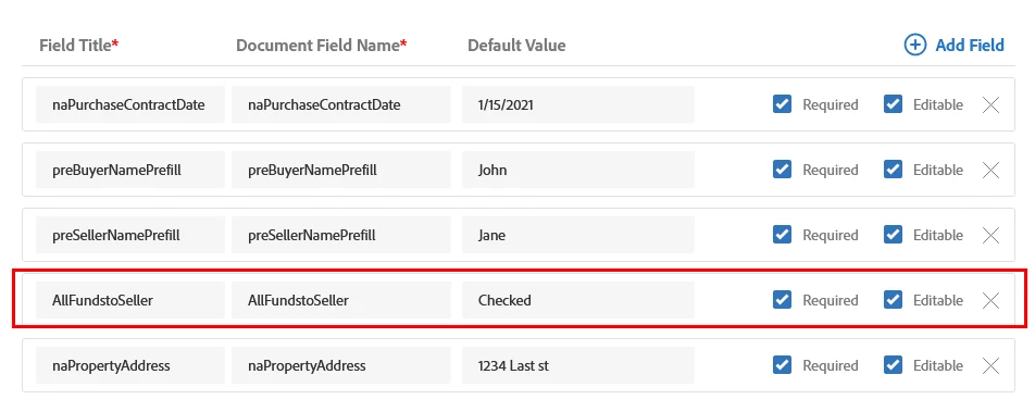I'm adding Sender Input Fields to my AdobeSign Workflow and am able to make it work using default values for Date and Text fields but can't figure out how to add default values for Radio Buttons, Drop Downs and Check Boxes. In the attached image you can see that I tried using "Checked" as the default value for the Radio Button but it didn't work. Before that I tried using the Group name for the Radio Buttons (naFunds) as the field name and the specific name of the Button (AllFundstoSeller) as the default value but that didn't work either.
