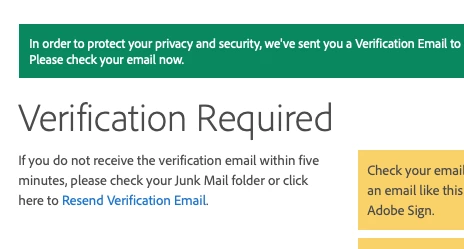 I'm trying to access my new Adobe Sign developer account and have received the "Welcome to Adobe Sign - please confirm your email address" email. When I click the link to active my account I get taken to the web page saying Verification Required, which is strange as I click the link to activate my account from the verification email that I just received: