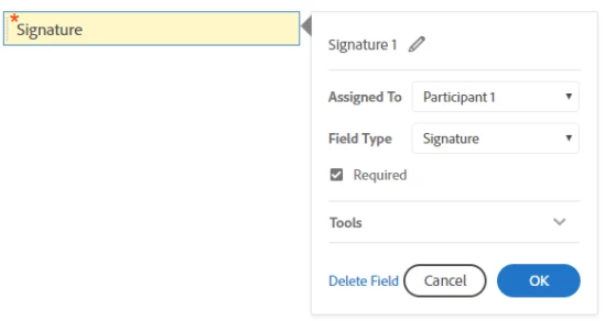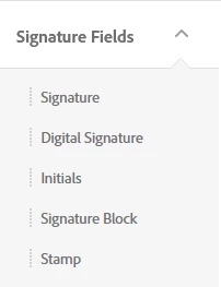 In Adobe Sign, there are 5 signature fields that you can select from and add to the document when sending it for signature.