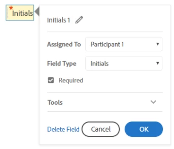 Initials: As by name, the field is used when you require the signer’s initials. However, when you add this field, a signature field also required on the document. If you do not add the signature field, Adobe Sign adds a Signature block at the bottom of the document.