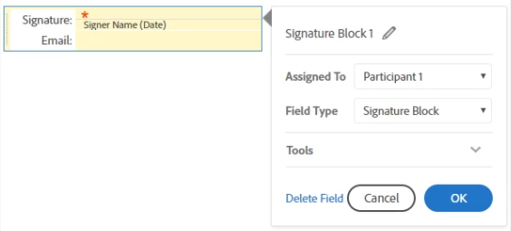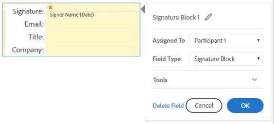 Signature block: It is a group of fields. Account Admins can adjust what fields are included in the signature block. Title and company name fields can be included in addition to the signature and e-mail fields. The signature block field cannot be made optional and is always required.
