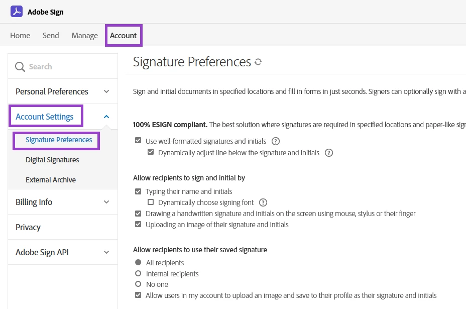There are various other signature preferences that you or account admin can manage from the account settings. To check those settings, go to Account > Account settings > Signature Preferences. Check the screenshot below.