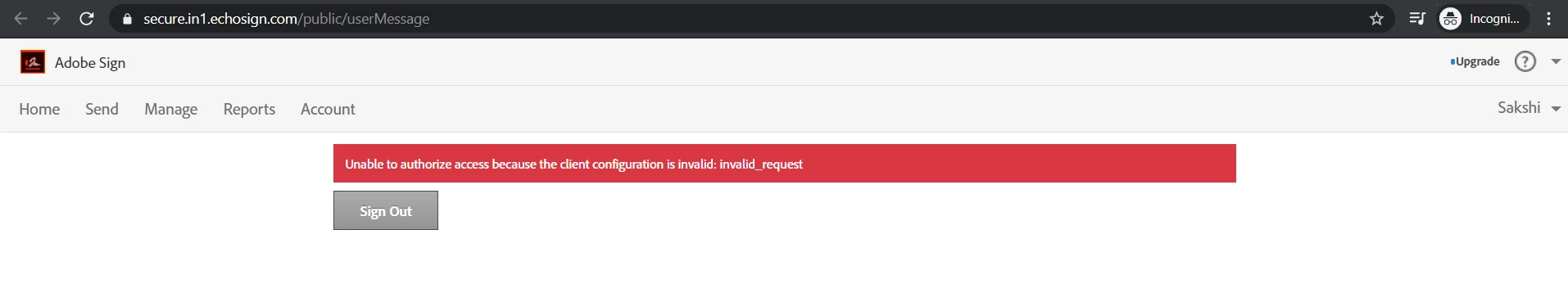 when clicking on Connect to Adobe Sign I am getting following error: