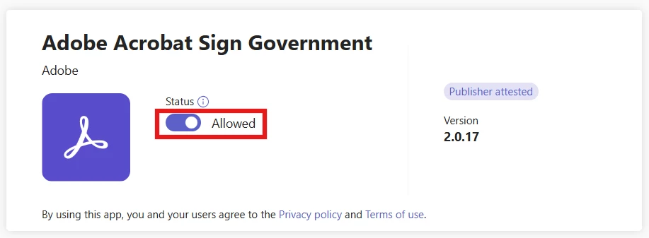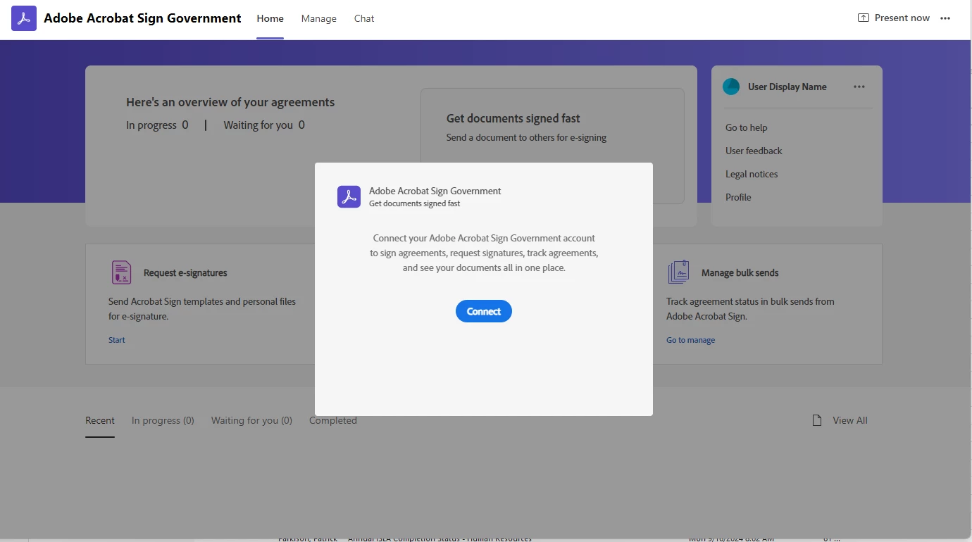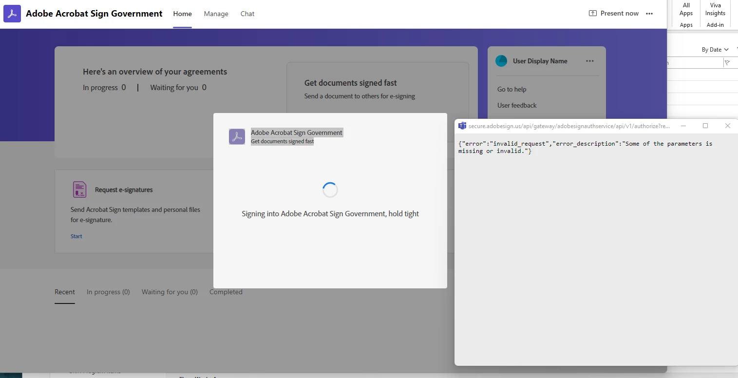We have the Adobe Acrobat for O365 GCC license. In MS Teams, we are able to go to Apps > add Adobe Acrobat Sign Government > click Open > click Connect button on the "Connect your Adobe Acrobat Sign Government account window" just fine. However, right after that, the window displays https://corporate.adobesign.us at the top, but the rest of the window is blank. Then the window changes to display https://secure.adobesign.us with the following error message: "error":"invalid_request","error_description":"Some of the parameters is missing or invalid." withot any other option to try.