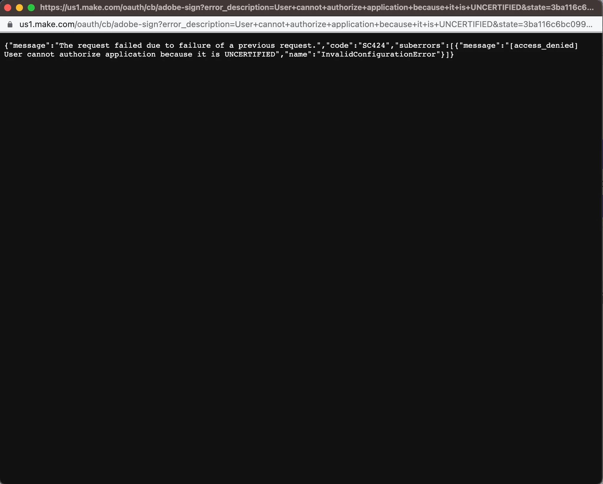 {"message":"The request failed due to failure of a previous request.","code":"SC424","suberrors":[{"message":"[access_denied] User cannot authorize application because it is UNCERTIFIED","name":"InvalidConfigurationError"}]}