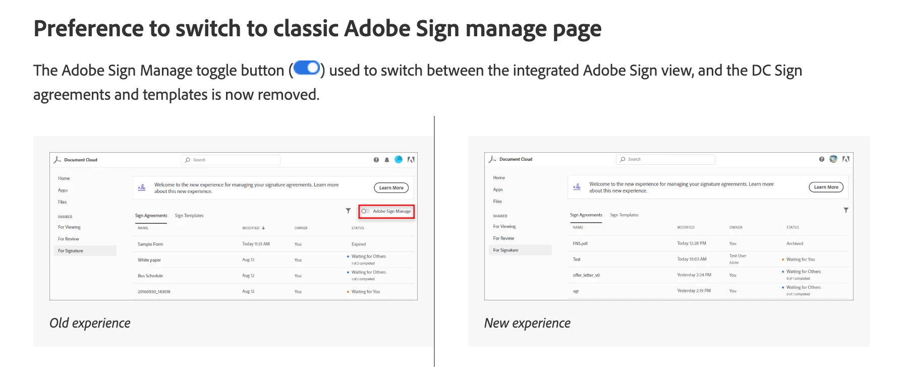 The Adobe Sign Manage toggle button is now removed from the Document Cloud. If you want to switch the view from DC Sign agreements and templates view to Adobe Sign view, please refer to the steps provided in the following help document under Manage Sign documents head line.