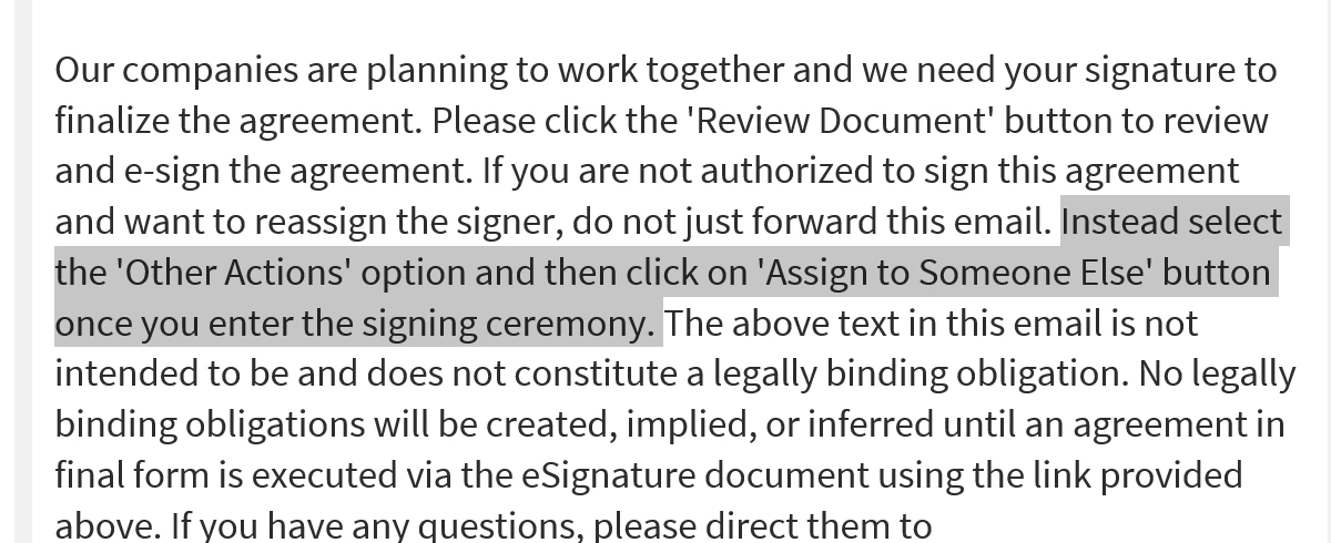 We need to know how we can change the wording (default) in the email that is sent to clients to sign documents OR how to open a support ticket. The wording in the default email is inaccurate. The wording in the email says: "Instead select the 'Other Actions' option and then click on the 'Assign to Someone Else' button once you enter the signing ceremony." The 'Other Actions' option does not exist. The 'Assign to Someone Else' button does not exist as written. There is an Option drop down menu and in that menu, there is a 'Delegate signing to another' option. We would like the wording in the default email changed to reflect reality, or instructions on how to change the default wording. Here are screen shots of what our clients are seeing.