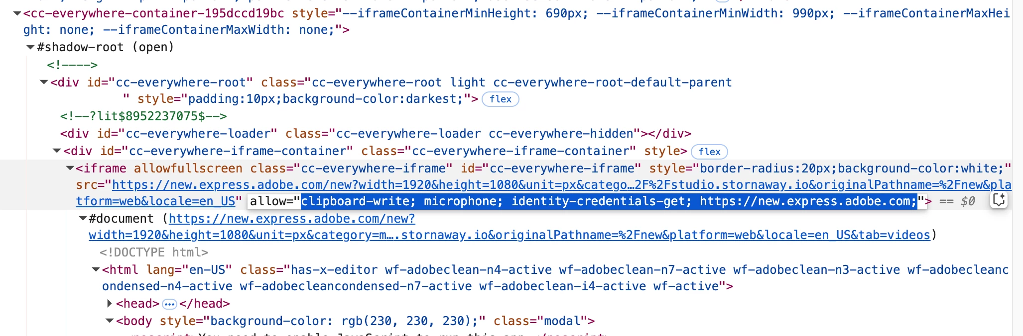 It needs to have allow="clipboard-write; microphone; camera; identity-credentials-get; https://new.express.adobe.com;">