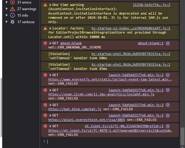 I am trying to integrate Express Embed with my angular application. I am able to see every scripts is getting fetched as it is happening in sample but still the SDK is not getting loaded I have also served my localhost with https and valid SSL certificate and allowed the port also in my console still its not opening. Some error are coming in console but those error are also coming in sample code too which is working fine.
