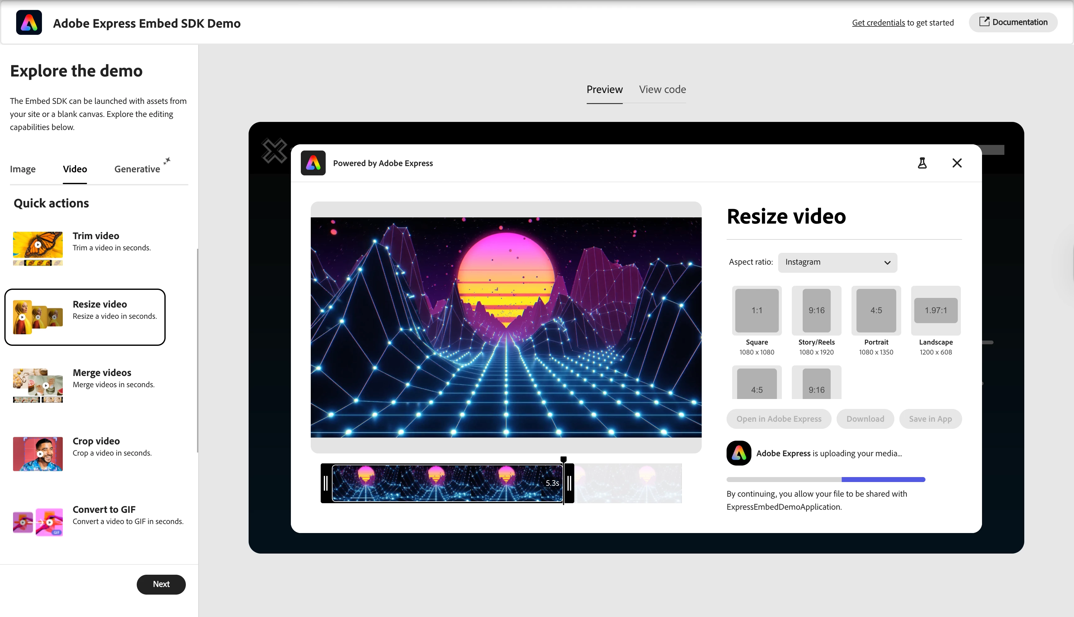 In the Adobe Express video quick actions SDK, features such as cropping and resizing videos are available. The download button is being displayed, but it is disabled. "By continuing, you allow your file to be shared with ExpressEmbedDemoApplication" This text is displayed below the button.