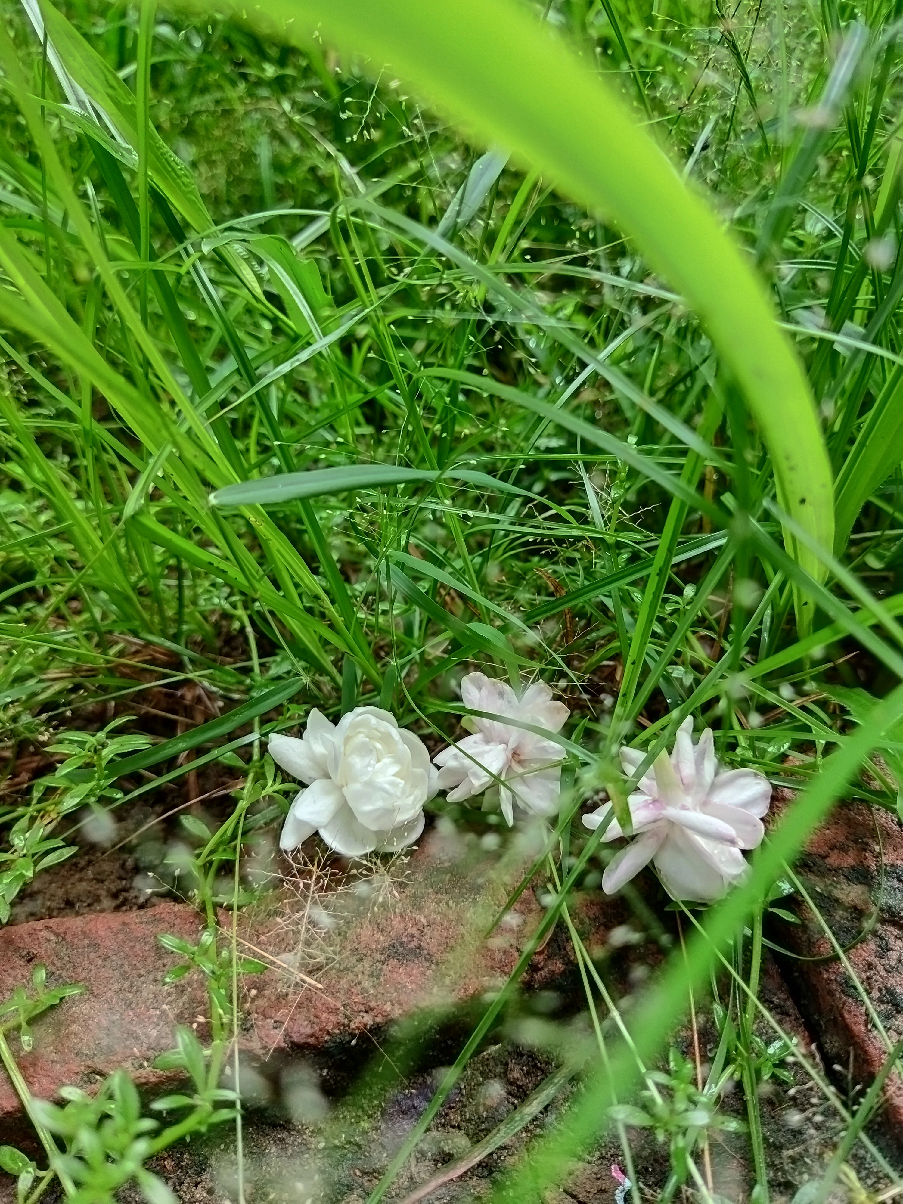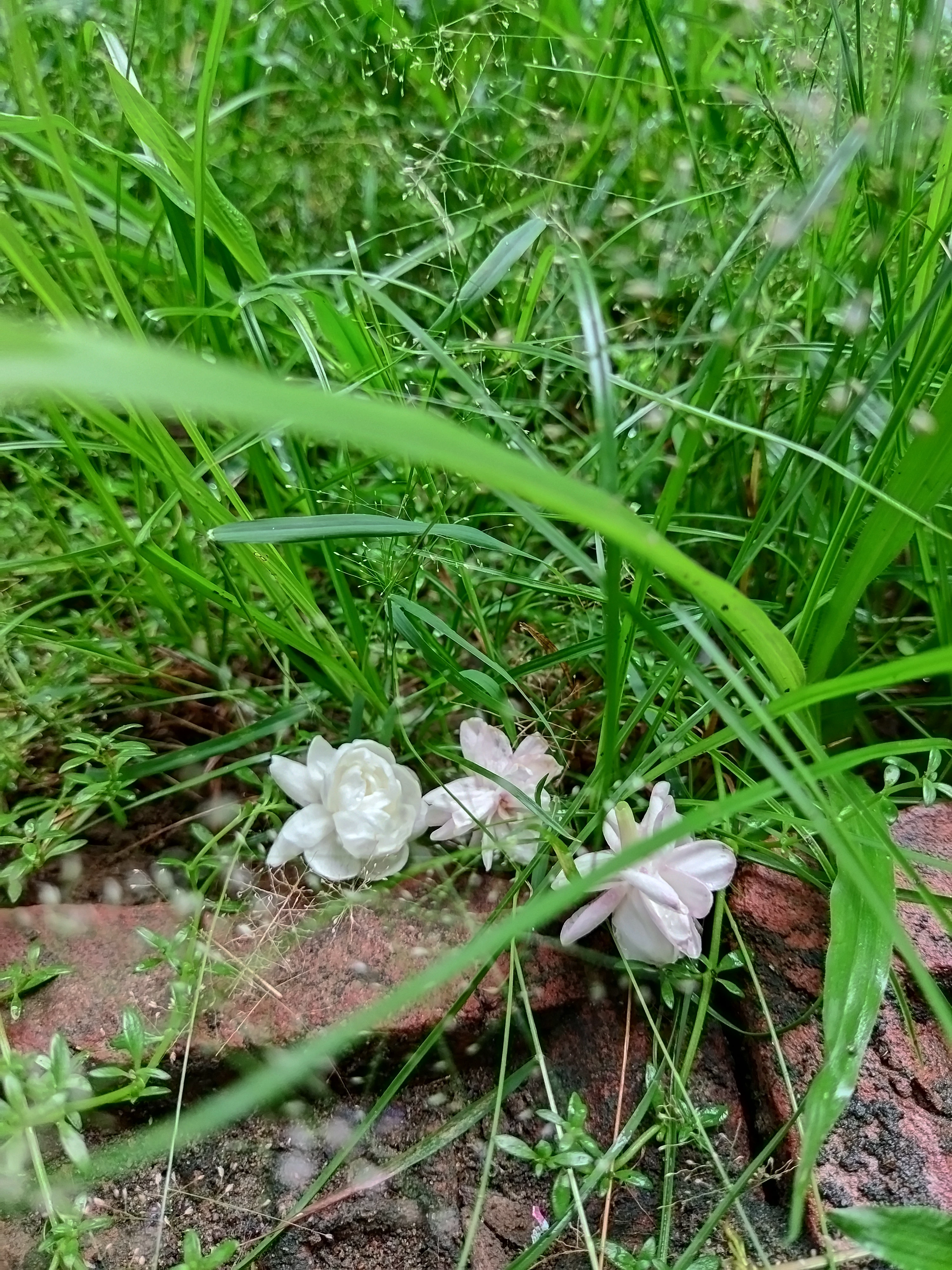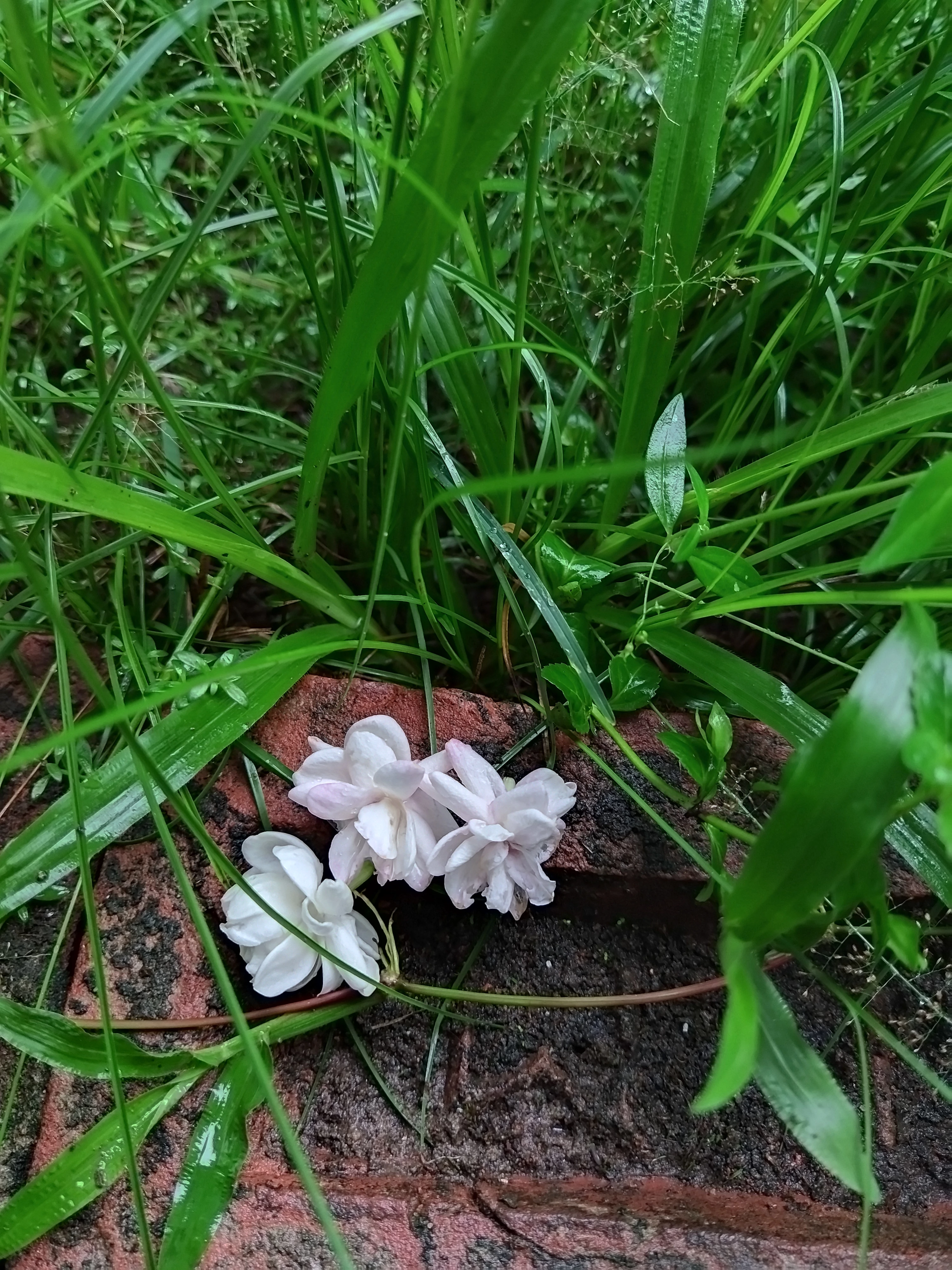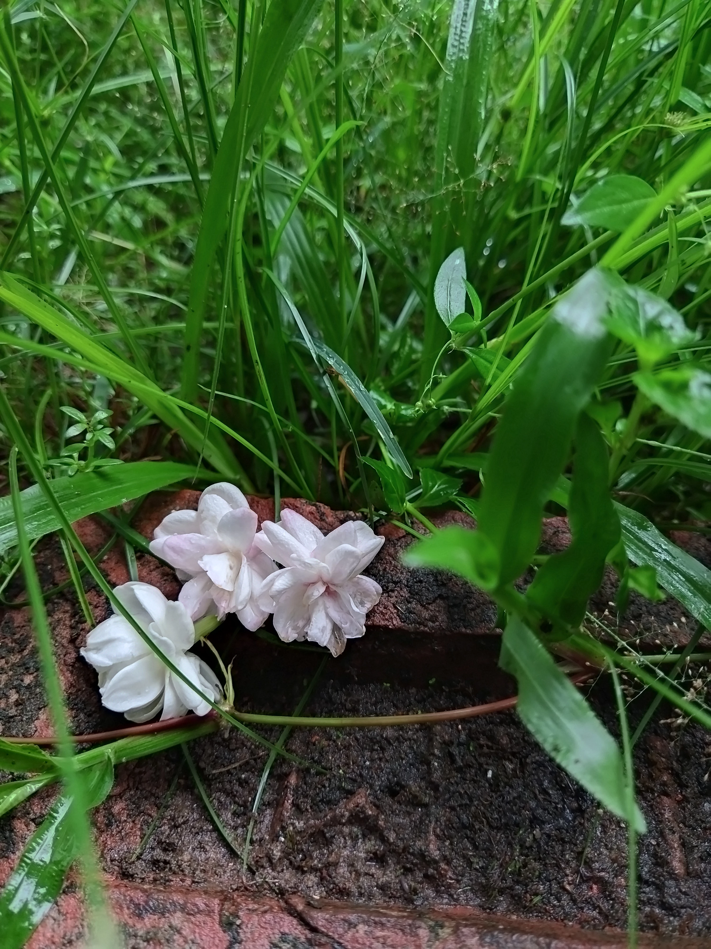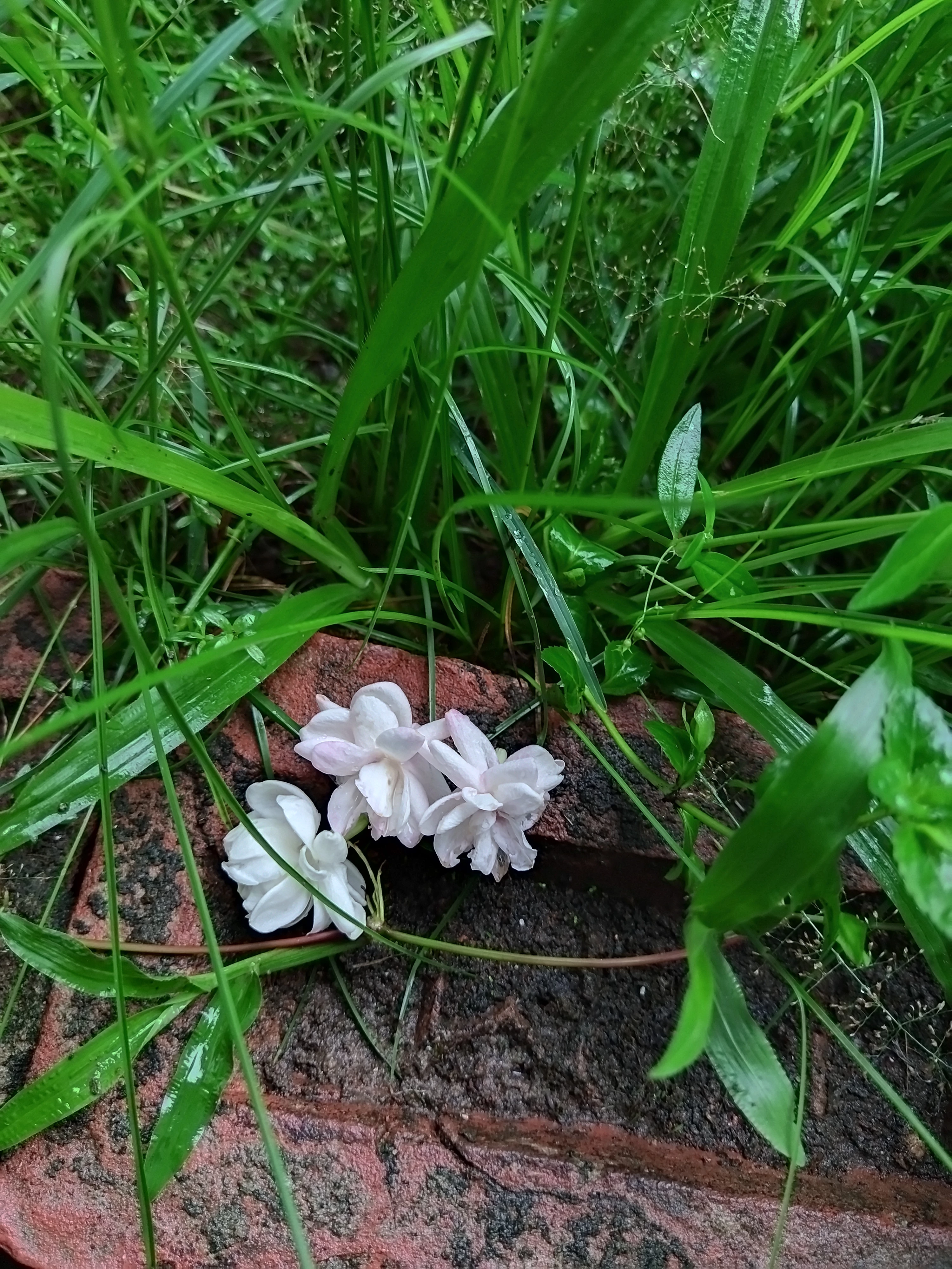 a jasmine flower on the grass and stone