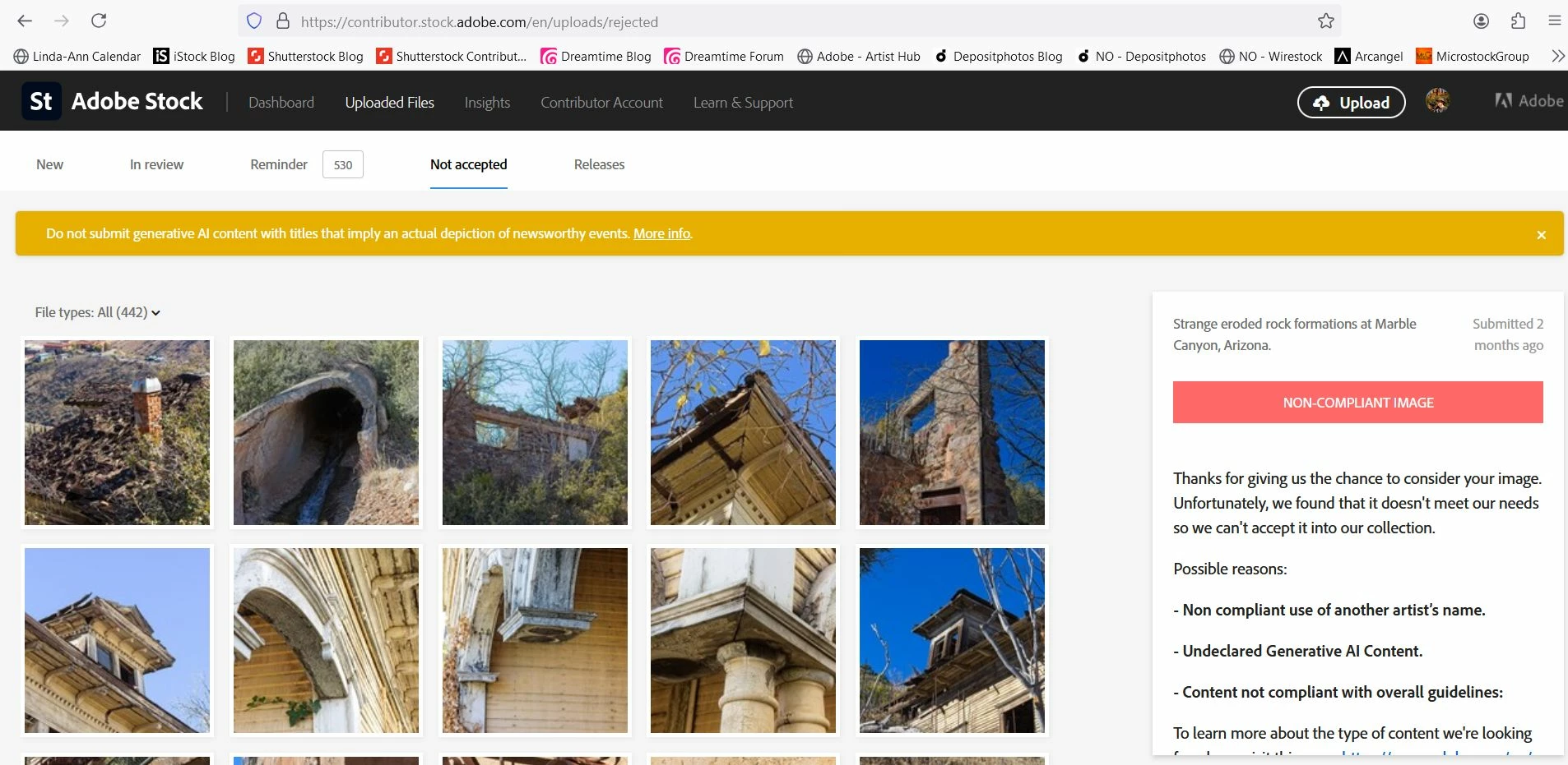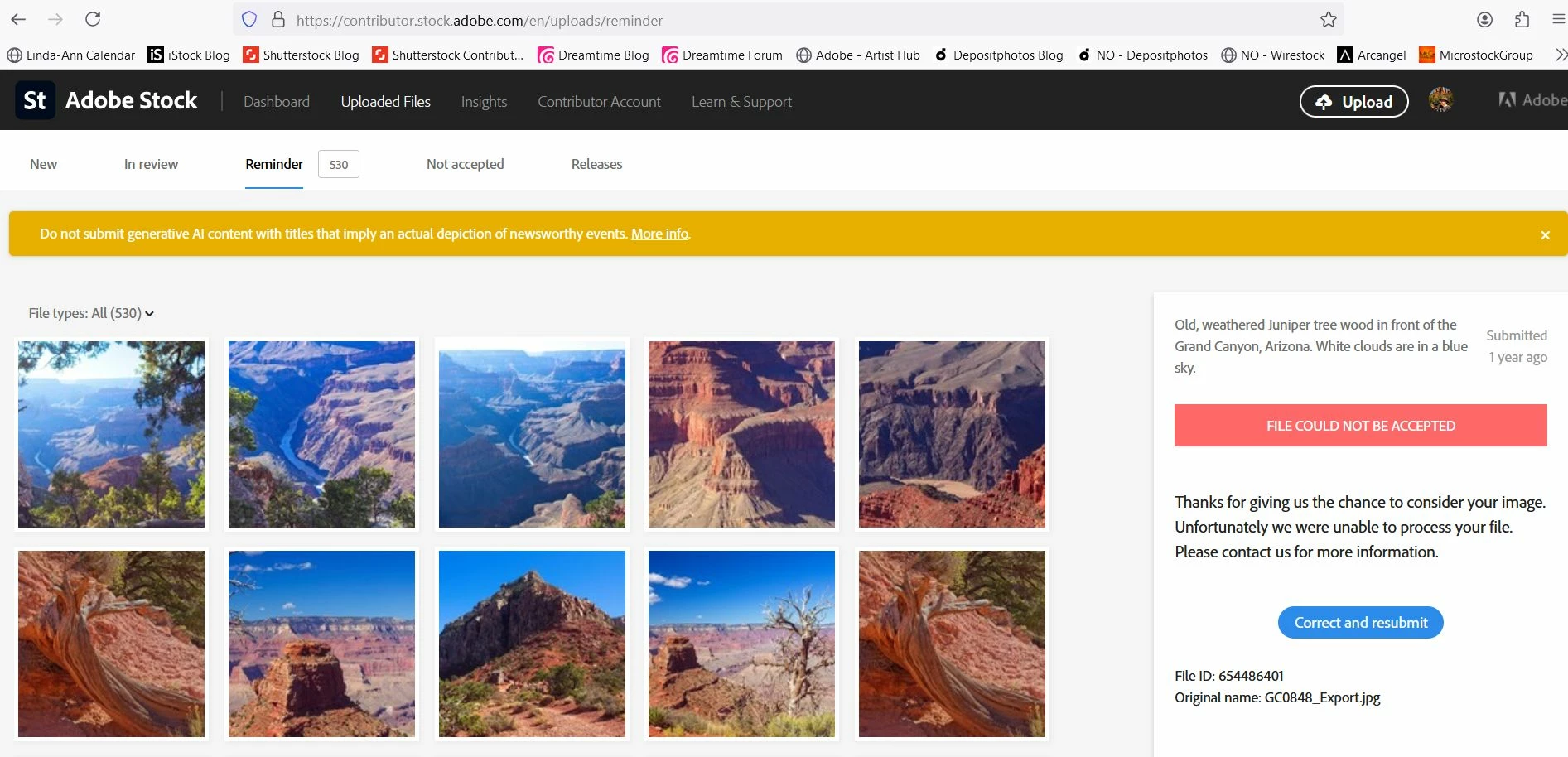 I'm not sure what's going on with Adobe, but a couple of weeks ago I had 991 previously accepted images suddenly rejected. Of those 442 of my approved images were moved to the Rejected tab, and 530 of my approved images were move to the Reminder tab.